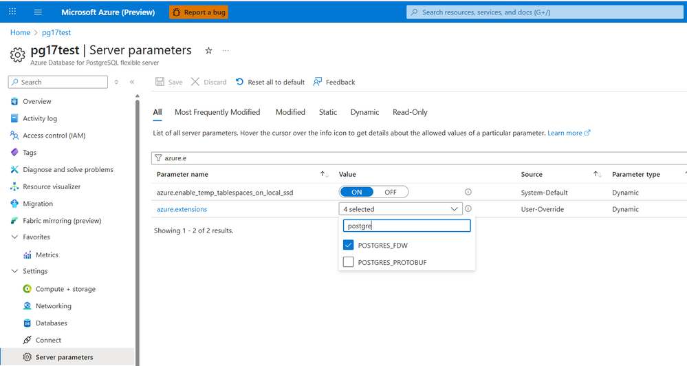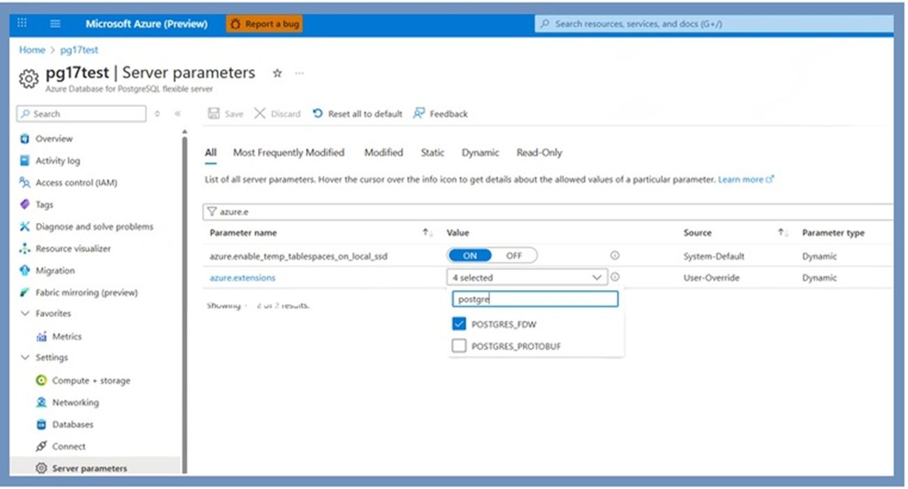 CREATE EXTENSION postgres_fdw; CREATE SERVER foreign_server FOREIGN DATA WRAPPER postgres_fdw OPTIONS (host 'pg17testremove_server.postgres.database.azure.com', dbname 'database2'remote_database, port '5432'); CREATE USER MAPPING FOR CURRENT_USER SERVER foreign_server OPTIONS (user 'postgres', password 'xxxxxx'); IMPORT FOREIGN SCHEMA public LIMIT TO (products, orders) FROM SERVER foreign_server INTO public; The query to populate the customer_orders table is fetching the data from the foreign tables joining with customers table data and inserting into customer_orders table.