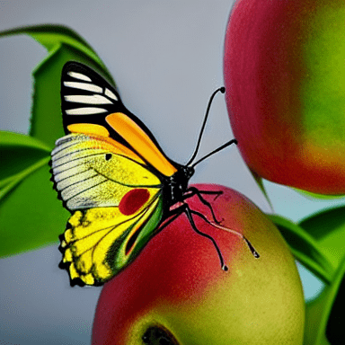 image_output = pipe("A colorful butterfly sitting on apples", image_normal, num_inference_steps=20).images[0] image_output