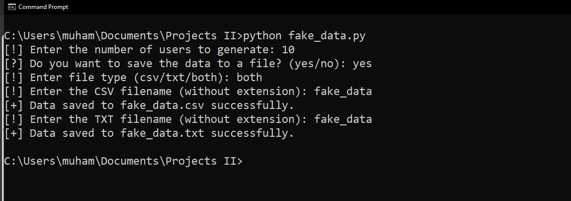 # Get the number of users from user input. number_of_users = int(input("[!] Enter the number of users to generate: ")) # Generate user data using the specified number of users. user_data = generate_user_data(number_of_users) # Ask the user if they want to save the data to a file. save_option = input("[?] Do you want to save the data to a file? (yes/no): ").lower() # If the user chooses to save the data. if save_option == 'yes': # Ask the user for the file type (CSV, TXT, or both). file_type = input("[!] Enter file type (csv/txt/both): ").lower() # Save to CSV if the user chose CSV or both. if file_type == 'csv' or file_type == 'both': # Ask the user for the CSV filename. custom_filename_csv = input("[!] Enter the CSV filename (without extension): ") # Concatenate the filename with the .csv extension. filename_csv = f"{custom_filename_csv}.csv" # Call the save_to_csv function to save the data to the CSV file. save_to_csv(user_data, filename_csv) # Save to TXT if the user chose TXT or both. if file_type == 'txt' or file_type == 'both': # Ask the user for the TXT filename. custom_filename_txt = input("[!] Enter the TXT filename (without extension): ") # Concatenate the filename with the .txt extension. filename_txt = f"{custom_filename_txt}.txt" # Call the save_to_text function to save the data to the text file. save_to_text(user_data, filename_txt) # If the user entered an invalid file type. if file_type not in ['csv', 'txt', 'both']: # Print an error message indicating that the file type is invalid. print("[-] Invalid file type. Data not saved.") # If the user chose not to save the data, print it vertically. else: # Call the print_data_vertically function to print the data vertically. print_data_vertically(user_data)