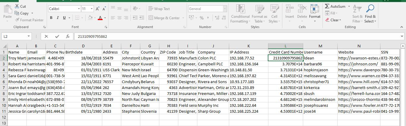 One thing to note is that Excel tends to shorten large numbers to their scientific forms (as seen in the ‘Credit Card Number' column). To see the actual (extended) value, simply double-click on the value you’re trying to see (as you can see for the first value in the said column).