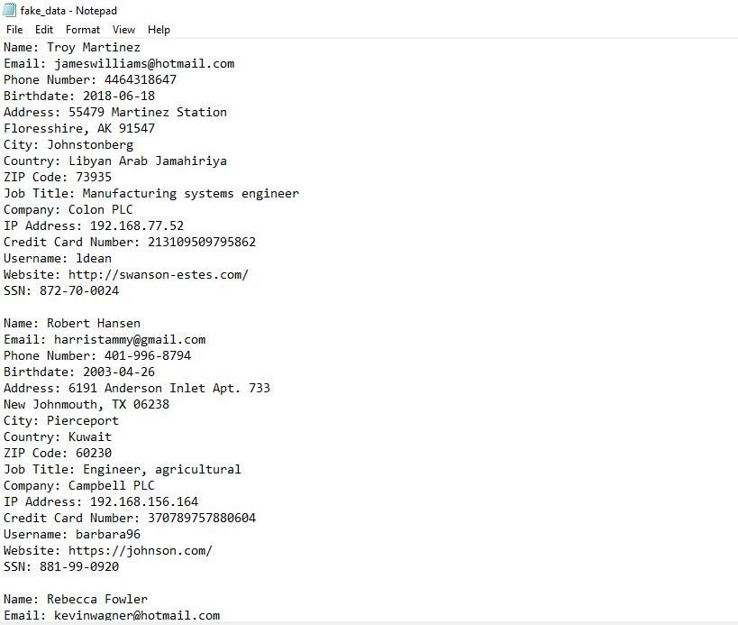 , you can generate a wide range of fake data, including names, addresses, phone numbers, email addresses, dates of birth, credit card numbers, and more. This can be especially useful in scenarios where using real data is impractical or poses privacy concerns. Feel free to check out the documentation here.