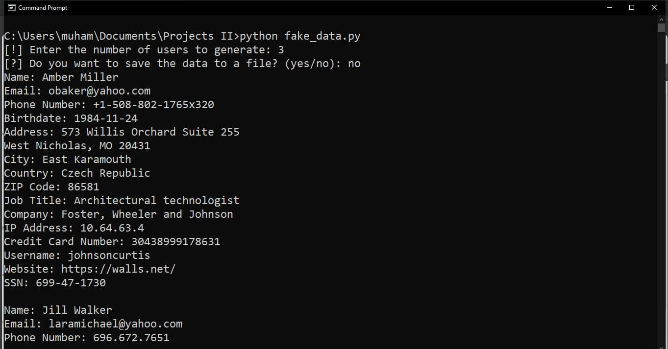 There you have it. We just wrote a program that can be used to generate fake user data. Let’s run our code to see how it works. Please bear in mind that I will select the ‘both’ option for testing purposes when asked for the file type I want. Feel free to test all available options. Also, the generated files will be saved in your current working directory.