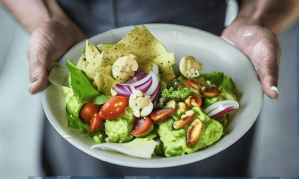 prompt = "A salad with tomatoes and guanas chips mixed with ketchup and mustard and bay leaf and guacamole and onions and ketchup and luscious patty with sesame seeds and cashews and onions and ketchup, ethereal," pipe(prompt=prompt, image=img, negative_prompt=None, strength=0.7).images[0]