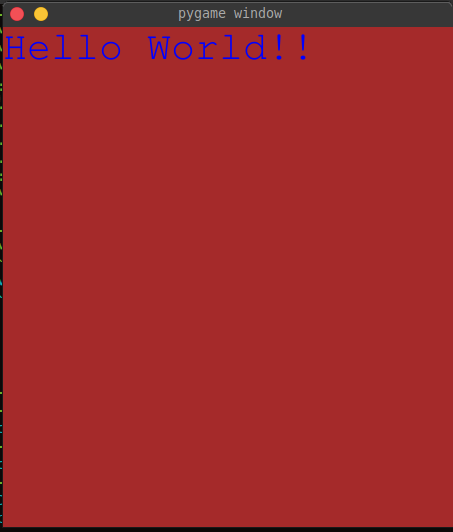 pygame.init() pygame.font.init() font = pygame.font.SysFont("Courier New", 40) running = True screen = pygame.display.set_mode((450, 500)) screen.fill("brown") message = font.render("Hello World!!", True, ("blue")) screen.blit(message,(0,0)) pygame.display.update() while running: for event in pygame.event.get(): if event.type == pygame.QUIT: running = False pygame.quit()