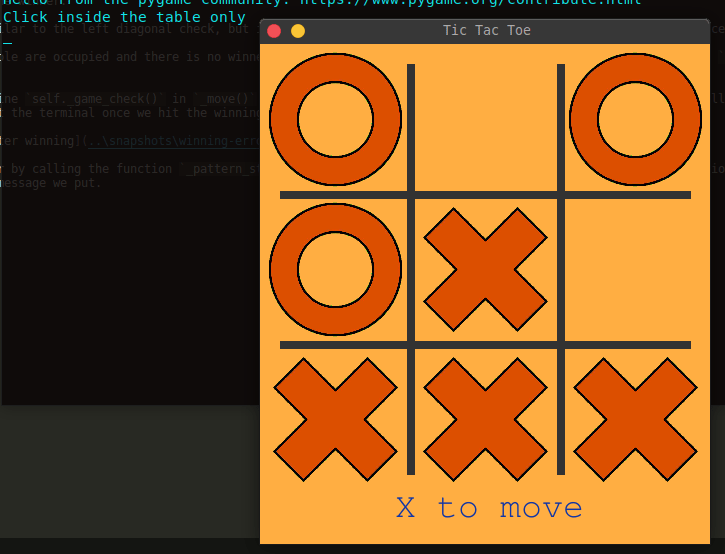 function. If we try to run the game instantly in this stage, we'll get an outcome of getting the message "Click inside the table only" at the terminal once we hit the winning patterns.