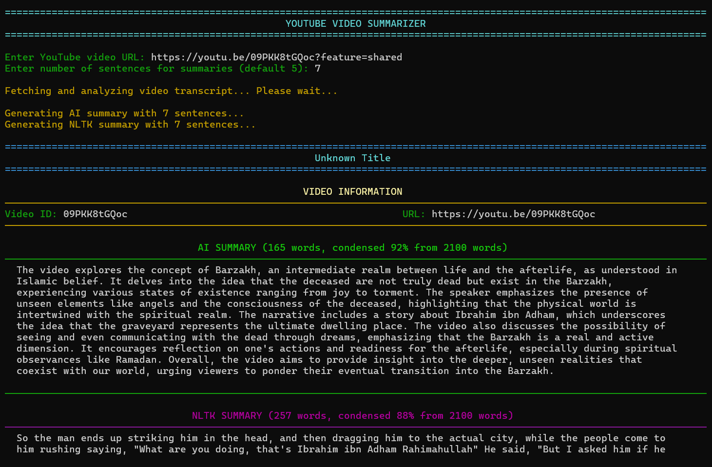 if __name__ == "__main__": # Get terminal width try: terminal_width = os.get_terminal_size().columns # Limit width to reasonable range terminal_width = max(80, min(terminal_width, 120)) except: terminal_width = 80 # Default if can't determine # Print welcome banner print(Fore.CYAN + Style.BRIGHT + "\n" + "=" * terminal_width) print(Fore.CYAN + Style.BRIGHT + "YOUTUBE VIDEO SUMMARIZER".center(terminal_width)) print(Fore.CYAN + Style.BRIGHT + "=" * terminal_width + "\n") youtube_url = input(Fore.GREEN + "Enter YouTube video URL: " + Fore.WHITE) num_sentences_input = input(Fore.GREEN + "Enter number of sentences for summaries (default 5): " + Fore.WHITE) num_sentences = int(num_sentences_input) if num_sentences_input.strip() else 5 print(Fore.YELLOW + "\nFetching and analyzing video transcript... Please wait...\n") result = summarize_youtube_video(youtube_url, num_sentences) print_summary_result(result, width=terminal_width)