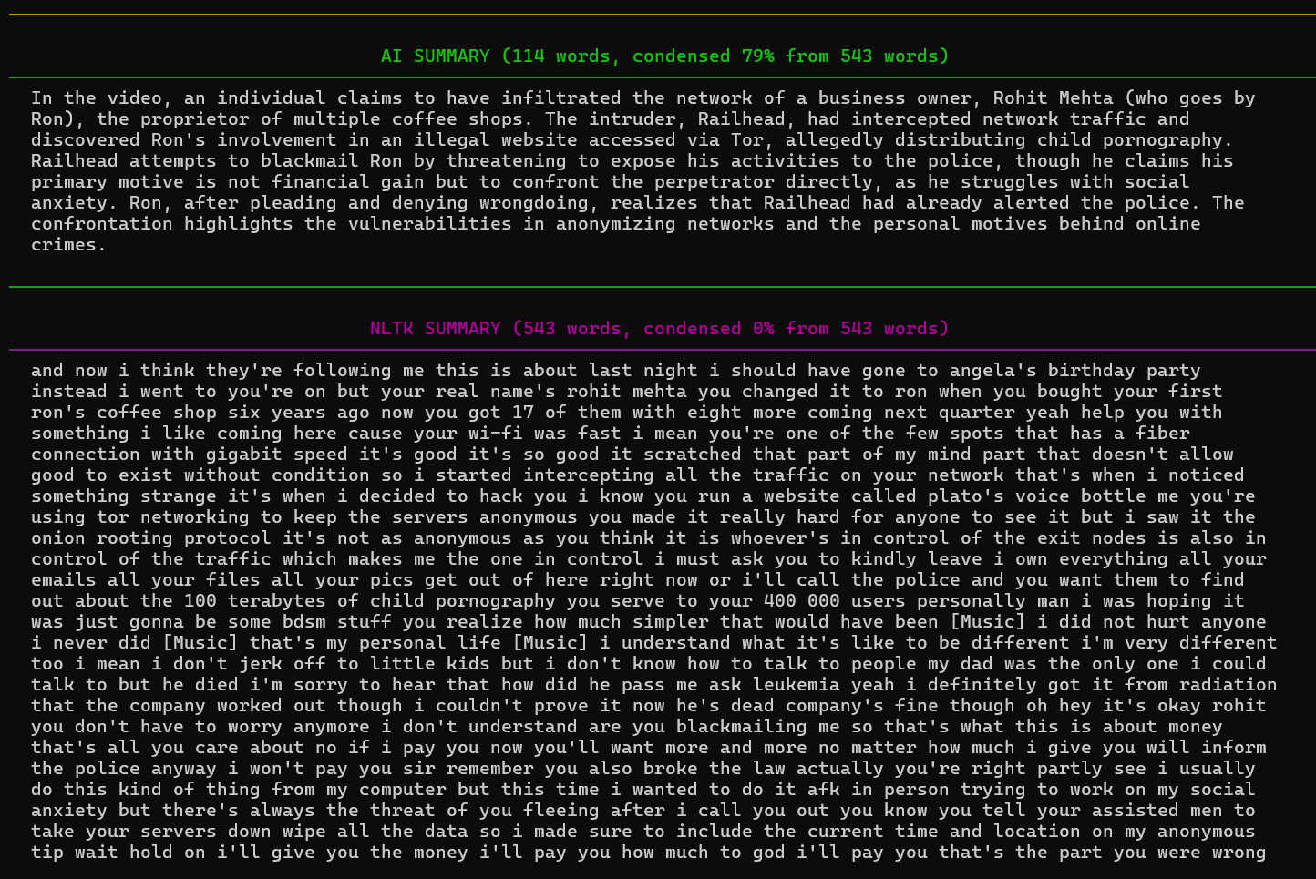 function displays the final summary result in a structured format. It prints a header with the video title, metadata, and the summarized transcript (for both “AI” and NLTK) with appropriate formatting and spacing. If an error occurs, it prints an error message in a red box.
