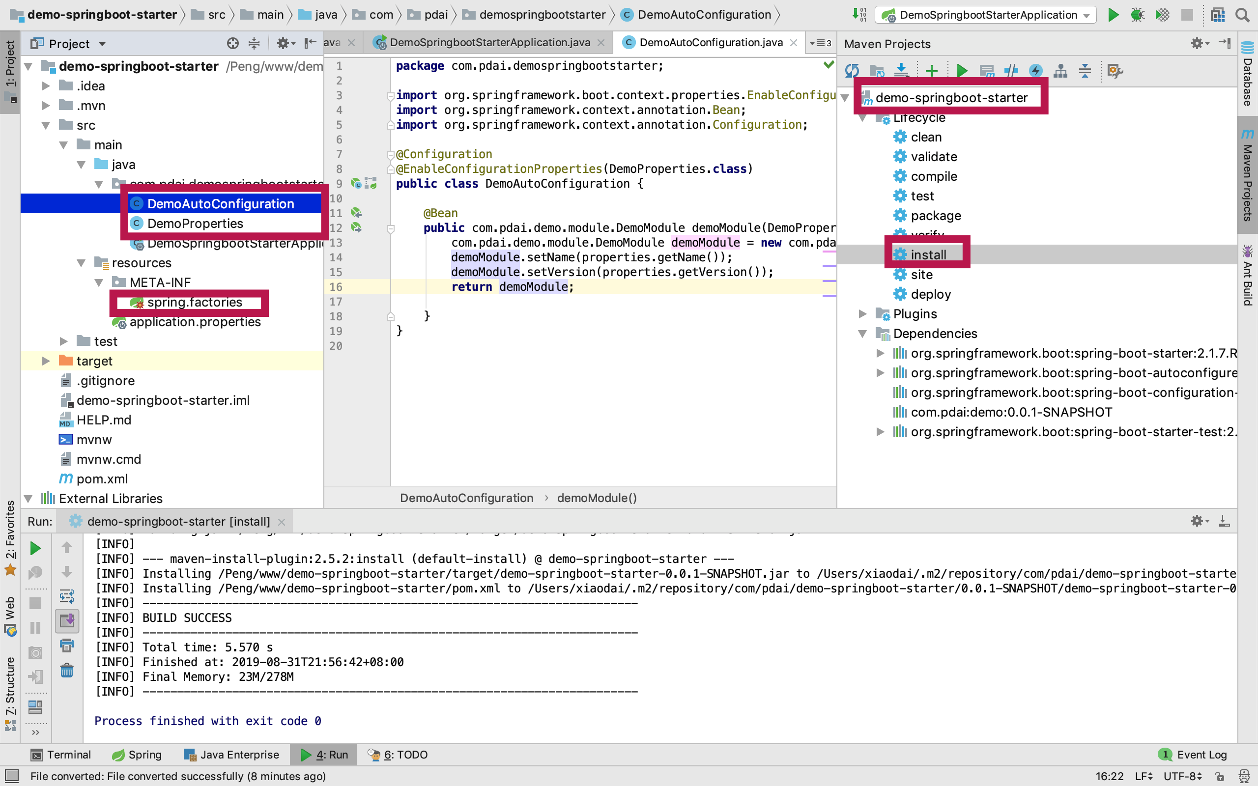 org.springframework.boot.autoconfigure.EnableAutoConfiguration=\ com.pdai.demospringbootstarter.DemoAutoConfigurationinstall