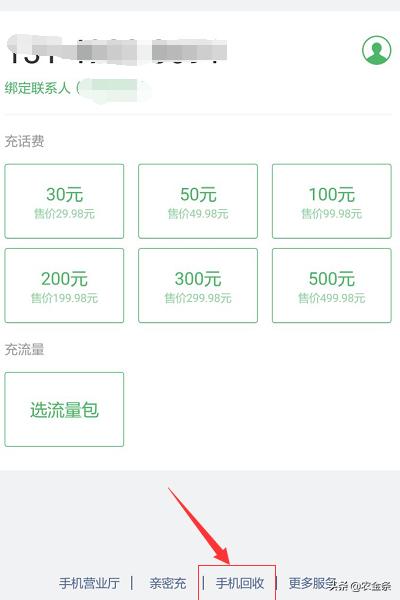 5、第五步,进入手机充值页面后,右下方有一个手机回收,点击【手机回收】;