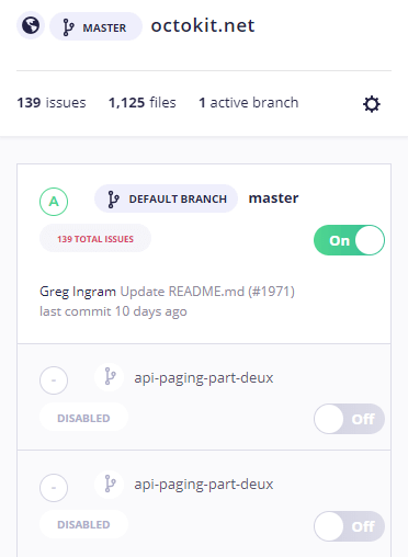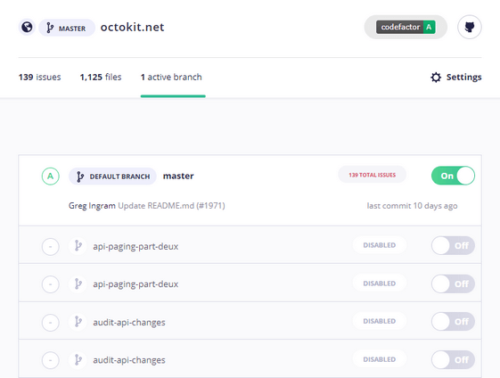 CodeFactor allows you to toggle inspection for any repository branch on the fly.
