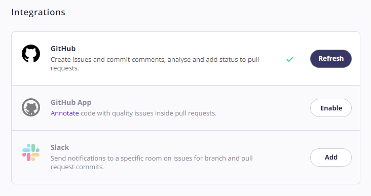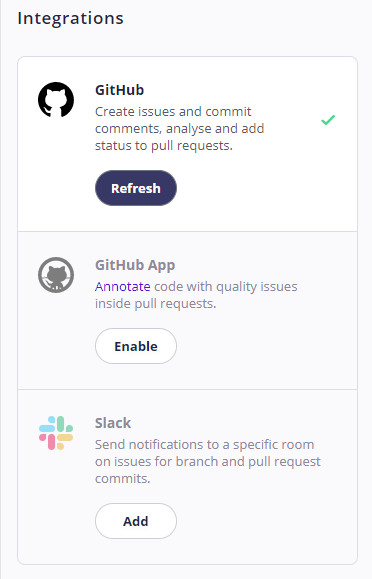 CodeFactor integrates with Slack to send code quality notifications for every commit in branch or pull request. To install, go to repository Settings page.