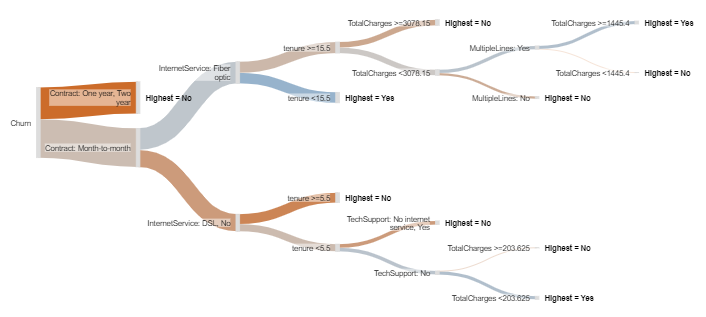 - Among the people on a one month contract, the best predictor is their internet service, with people on a fiber optic service being much more likely to churn (again, we can see this both by the blueness of the branch, and if we hover over the node).