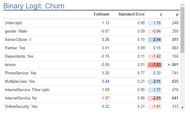 The main challenge of logistic regression is that it is difficult to correctly interpret the results. In this post I describe why decision trees are often superior to logistic regression, but I should stress that I am not saying they are necessarily statistically superior. All I am saying is that they are better because they are easier and safer to use. Even the most experienced statistician cannot look at the table of outputs shown below and quickly make precise predictions about what causes churn. By contrast, a decision tree is much easier to interpret.