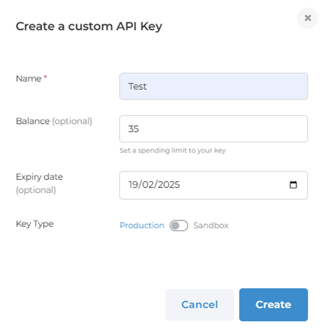 Each key can be assigned to either a Production or Sandbox environment based on your needs, and you can set an unlimited budget for each API key.