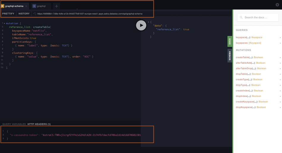 Step 6a: Move to tab GRAPHQL-SCHEMA, everything should be set, use the following mutation to create a new table: _Remember to change the keyspaceName if you used something different.