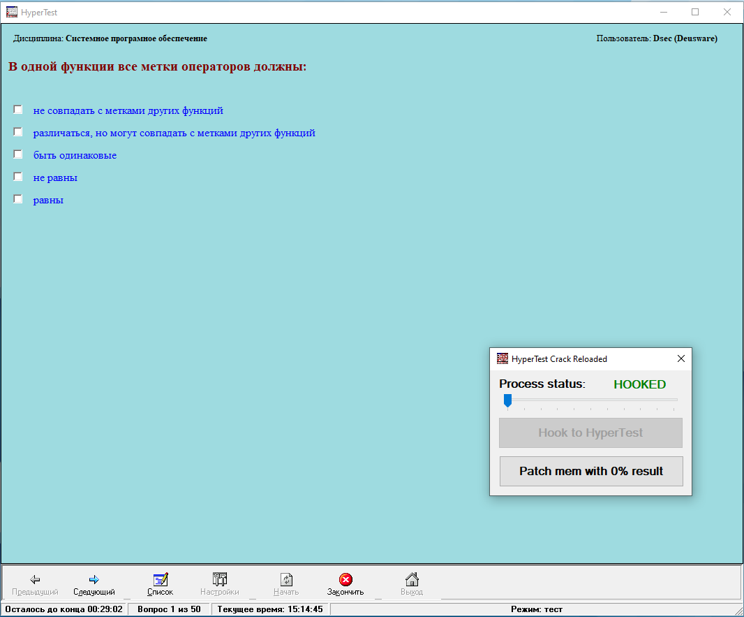 HyperTest Crack Reloaded Mempatcher for HyperTest (For test purpouses only) Step 1 Open HyperTest and HyperTest Crack Step 2 Press "Hook to HyperTest" button Step 3 Using TrackBar select desired score and press Patch mem with specified result Step 4 Press OK in Info MsgBox Step 5 You've got your score!