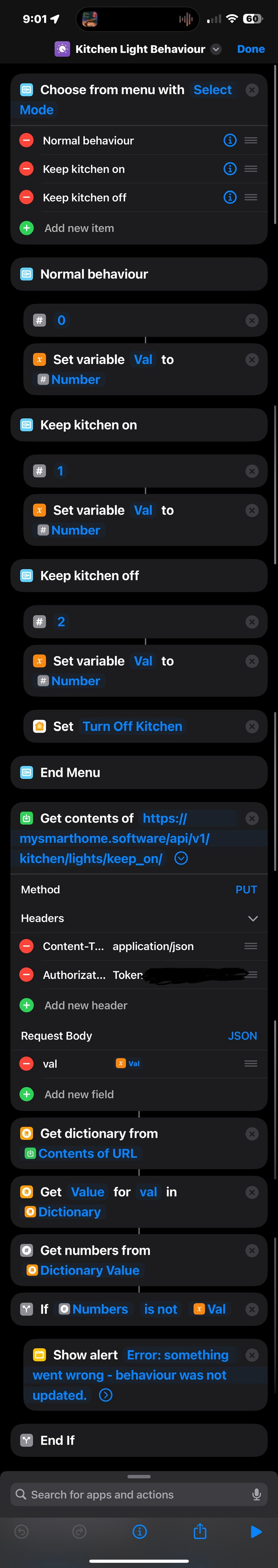 I started this project because I began to integrate smart home products with my home using the Apple Home system, and found some critical limitations of Apple's automation. One example of this is the creation of 'phantom' switches. e.g. a switch that is not attached to a physical Apple Home compatible device. It is really more of a global variable, but I wanted a feature that would enable me to modify the behaviour of my automations based on some button I press. I implemented this for my kitchen lights, which are controlled by an Aqara FP2 presence sensor. I often sit in my dining room to work which is on the border of the 'kitchen' zone in the Aqara app, so the lights would often randomly turn on or off when I didnt want them to. I realized that in the limited set of actions that an Apple Home shortcut can access, making HTTP requests to a url is included. Thus, I had the idea to use a REST API to implement a feature which would allow me to set this 'phantom' switch to 'stay-on', 'stay-off' or 'normal-behaviour' to change the behaviour of my kitchen light automation. Details of this can be found in Example Automations. My API is now running publically at MySmartHomeAPI and is being hosted on a load-balanced AWS Elastic Beanstalk instance.