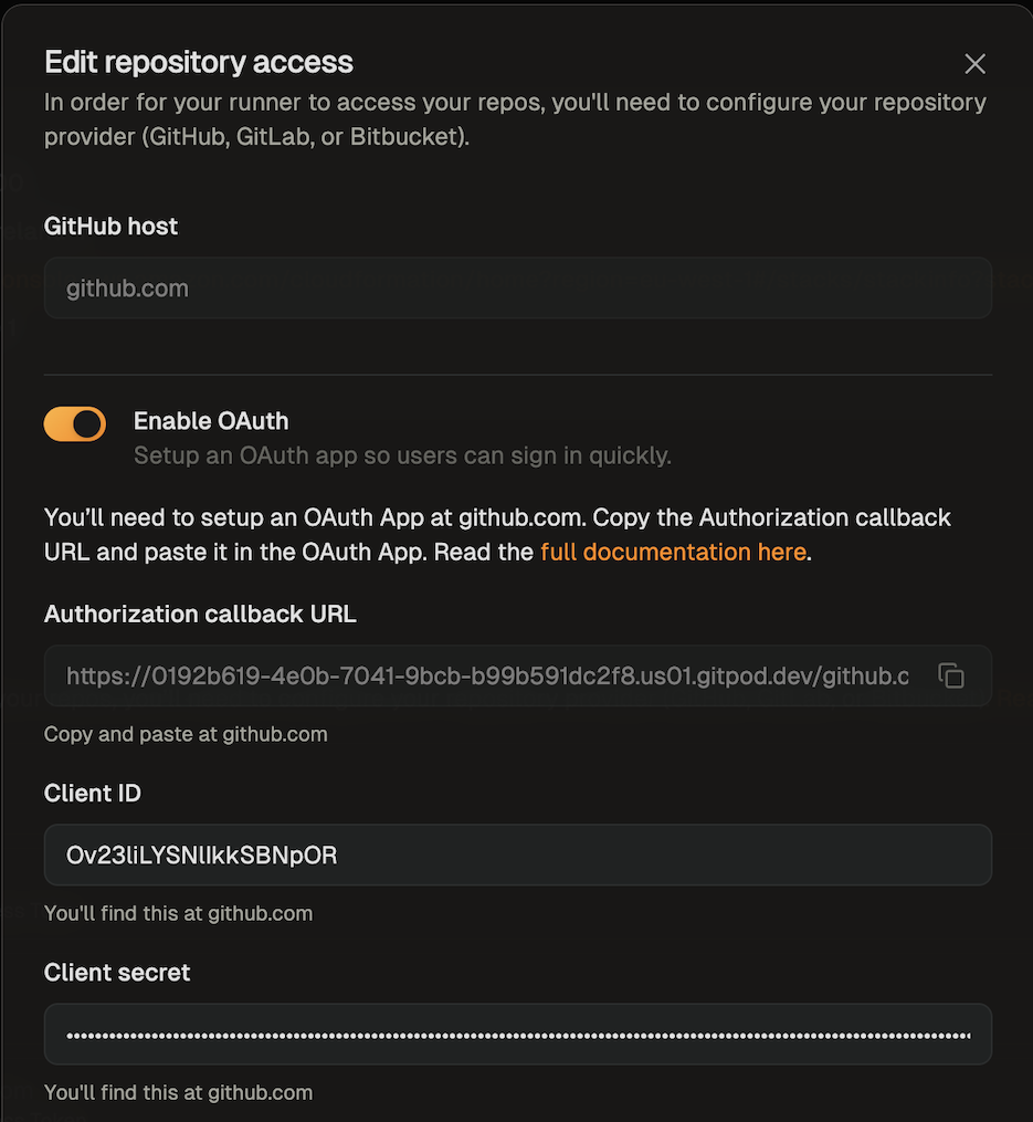 - After creating the OAuth app, provide the Client ID and Client Secret in the runner configuration dialog. The client secret will be encrypted with the runner’s public key, ensuring only the runner can read it.