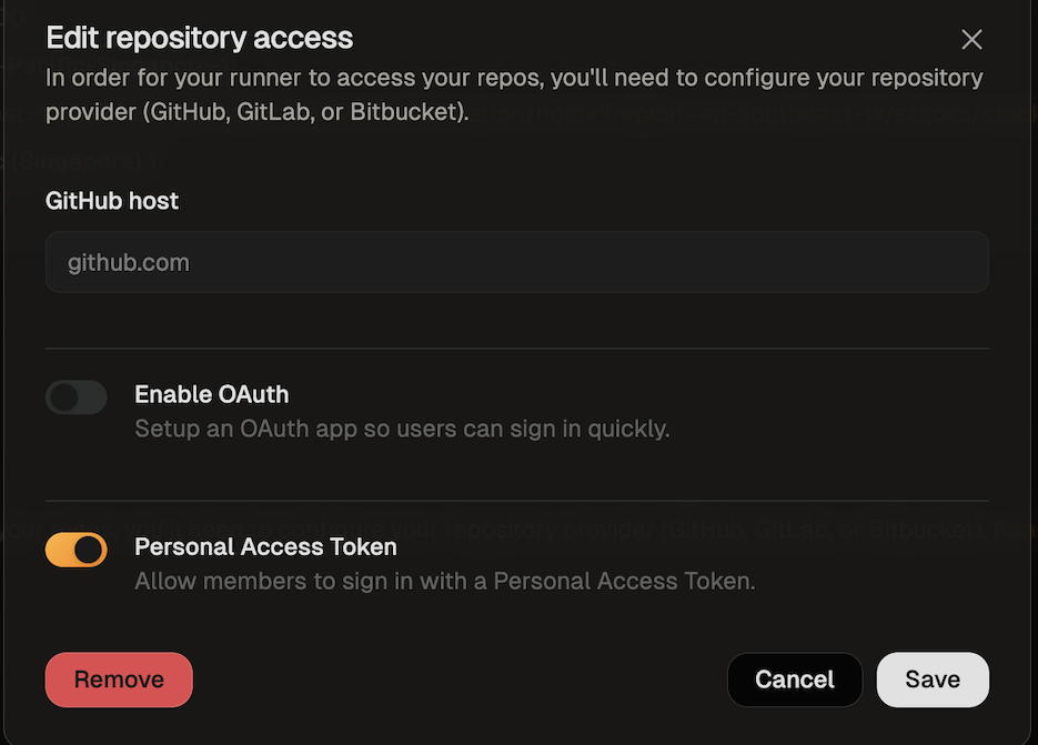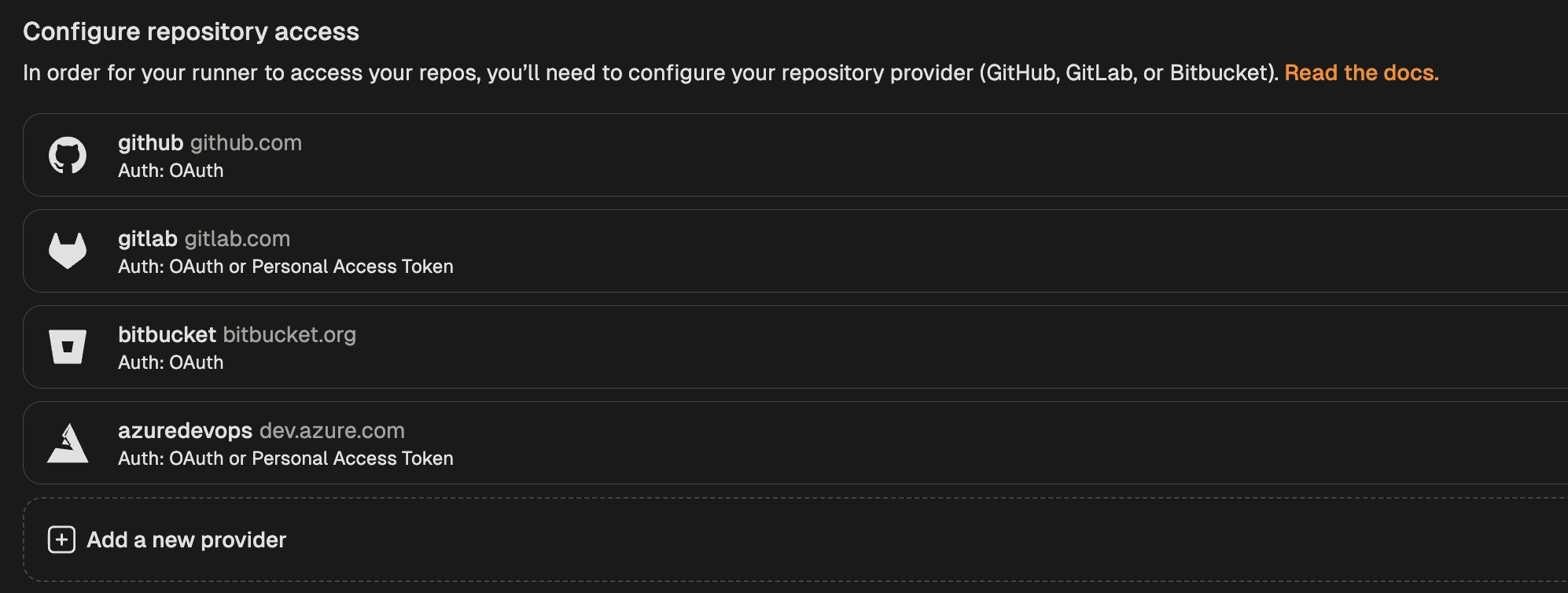 You can skip this step if someone has already set up the runner for you and SCM integration with GitHub has already been configured. In that case, you can go directly to Authorizing GitHub Access. This step allows administrators to configure what authorization methods (OAuth, PATs) and SCM providers (GitHub, GitLab, Bitbucket, Azure DevOps) will be available for authorization.