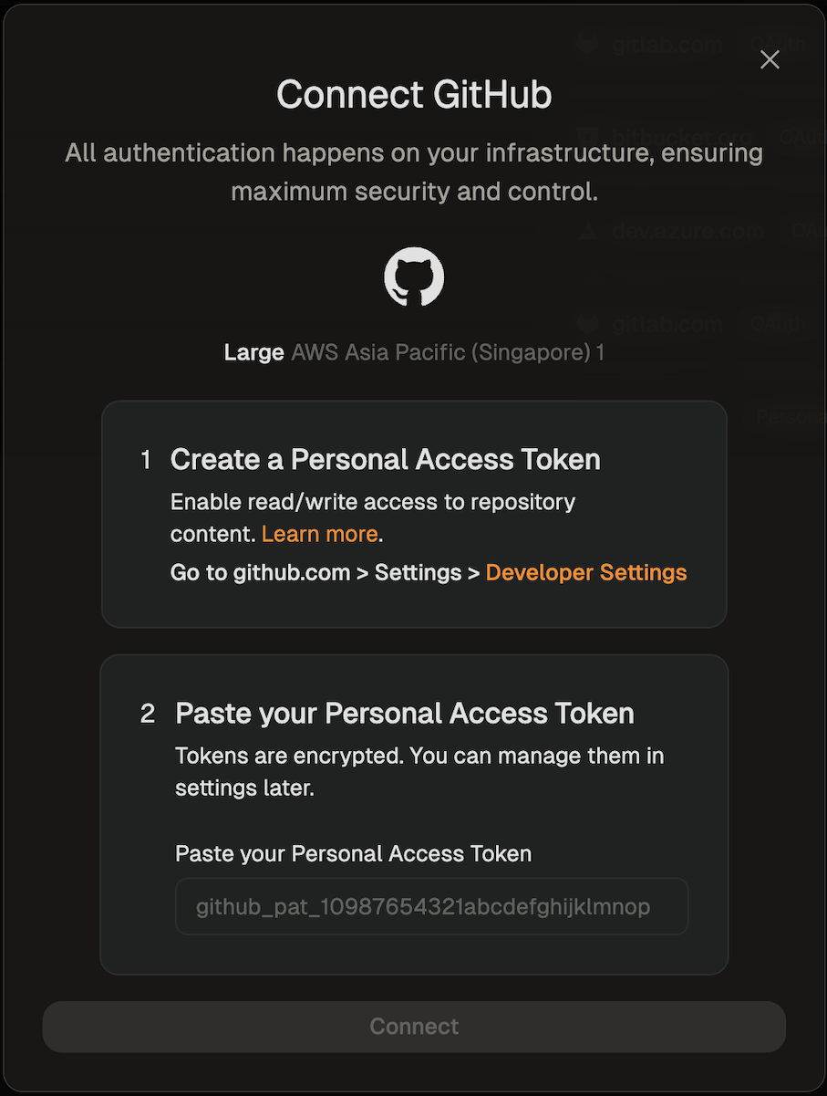 Ona Cloud provides built-in GitHub integration with no configuration required:- github.com is supported by default using Ona’s managed OAuth application