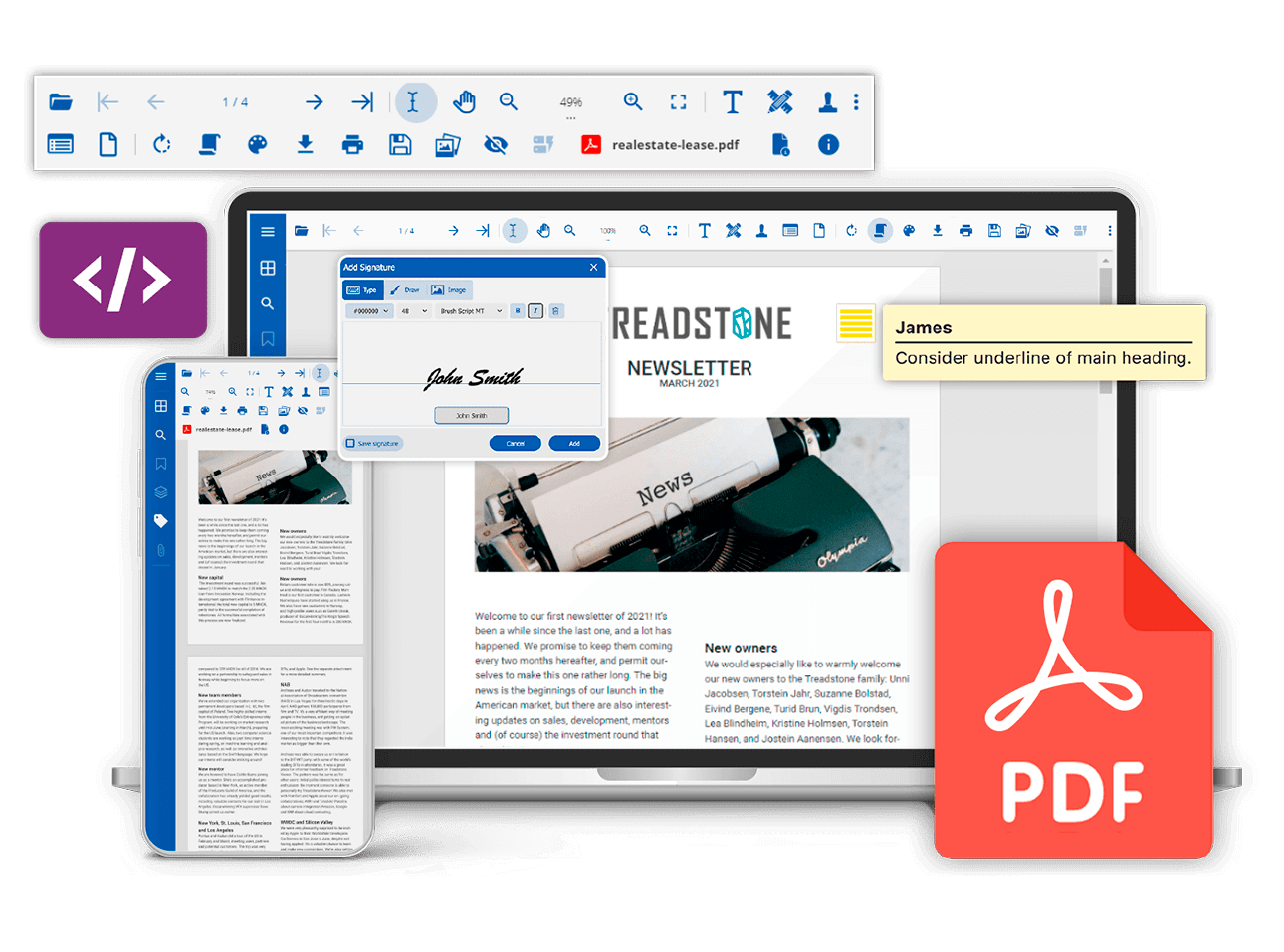 The Built‑In Tool Bar of DsPdfViewer provides a comprehensive, user‑friendly interface composed of toolbar icons at the top of the JavaScript PDF Viewer and feature‑specific side panels. Users can open PDFs, navigate between pages (including first, last, previous, next), zoom in and out, rotate pages, toggle full screen, print or download documents, and switch display layouts. Additional tools such as search, page thumbnails, bookmarks or document outlines, attachments, and article thread navigation are available via sidebar panels. The appearance and behavior of toolbar and panel elements (such as which buttons are shown, the page counter format, and sidebar visibility) can be customized to match branding or usage needs. The pageCounterFormat and emptyPageCounterFormat properties can be set to control the formatting of the shown page number when viewing a PDF document. This combination of toolbar + panels gives users efficient access to powerful PDF viewing features with minimal setup.