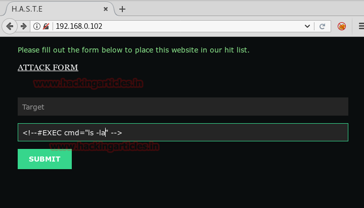 Now we go back to http://192.168.0.102/ and use server side injection to execute our commands.