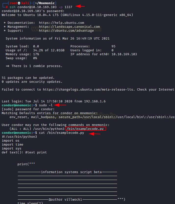 ssh condor@10.10.169.103 -p 1337 pasificbell1981 sudo -l cat /bin/examplecode.py