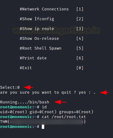 We get the list of choices that we talked about. We choose 0 option. When asked for confirmation, we provided dot (.). It displayed the Running message. This is where we executed the shell command to get the root shell. Immediately we got the root shell. All that is left is to read the root flag and conclude this machine.