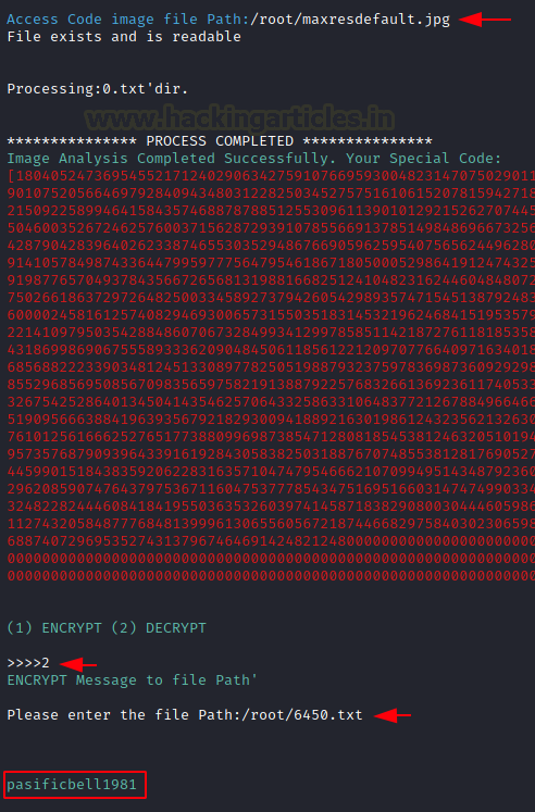 We provided it 2 files. First was the image file named maxresdefault that we just downloaded. Then it asked us the action to perform. We chose decryption. Then it asked us for the decryption file. This is where the 6450.txt file that we found earlier comes into picture. We provide the path for it as well. It decodes the password as pasificbell1981.