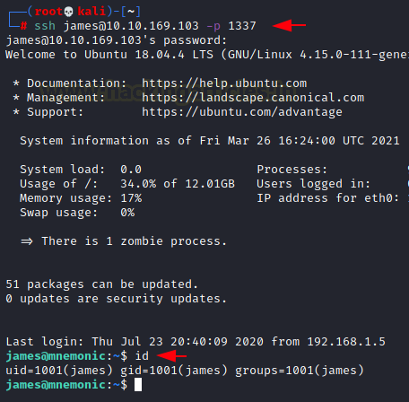 Since we have the ssh credentials for the james user, we used it to gain the ssh session on the machine. Remember to use port 1337 to login.