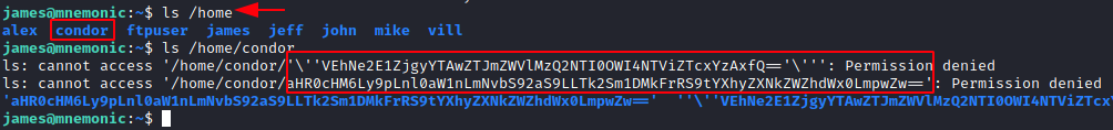 We began manually listing all of the users that provided us with condor. That note reminds us of Condor User. When we attempted to list the files in the condor user’s home directory, we saw that access was blocked; nonetheless, the directory names appeared to be base64 encoded.