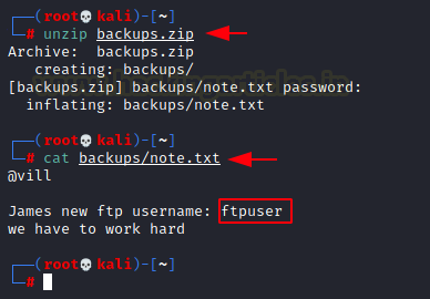 Now that we have the password for the compressed file, let’s extract the contents of it. We found a note inside. It tells us that the FTP service can be accessed using ftpuser username.