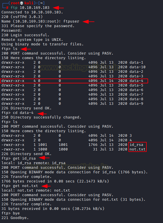 ftp 10.10.169.103 ftpuser love4ever ls cd data-4 get id_rsa get not.txt bye