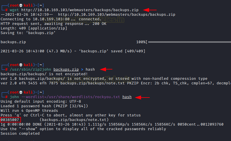 wget http://10.10.169.103/webmasters/backups/backup.zip /usr/sbin/zip2john backups.zip > hash john --wordlist=/usr/share/wordlists/rockyou.txt hash