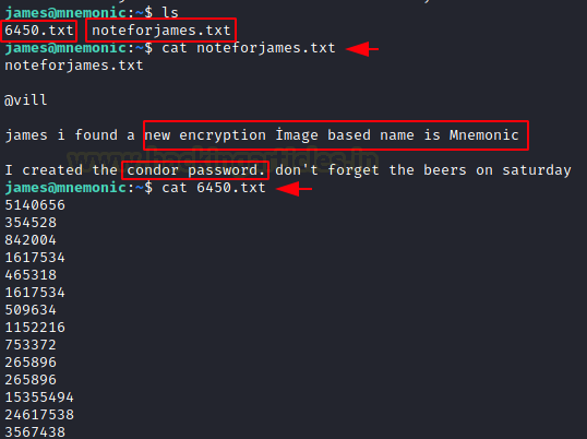 After listing the directory’s contents, we discovered a note file and a text file called 6450.txt. As we examine the notes, we discover that a novel form of encryption is being used. Additionally, we observe that a user condor has a newly established password. When we examine the 6450-text file, we discover arbitrary numerical strings that don’t seem to make sense. That Mnemonic Encryption is what we must look for.