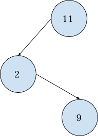 We first compare 2 with 11. Since 2 is less than 11. 2 will become the left child of 11.