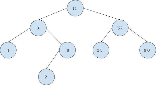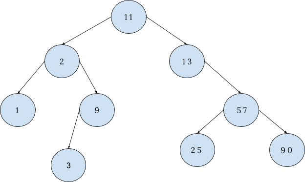 Insert the following elements to form a binary search tree: 11, 2, 9, 13, 57, 25, 1, 1, 90, 3. The first number to be inserted is 11. Since there are no nodes present thus 11 becomes the root node.