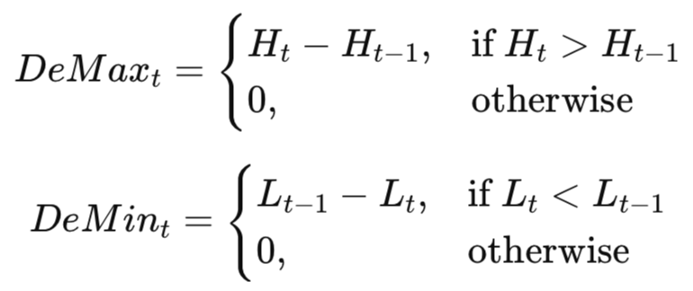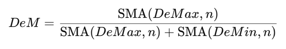 This oscillator, the DeMarker, was designed to get a reading on underlying demand by comparing the extremes in price of the current period to those in the prior. This can be useful in spotting market tops as well as bottoms, again in overbought and oversold situations. The basic formula is: