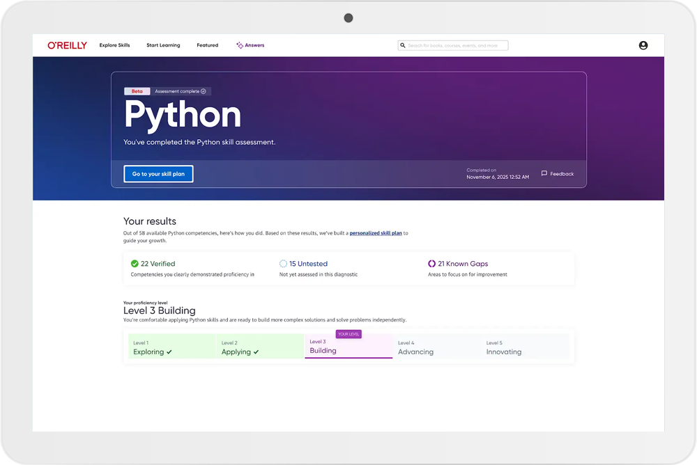 Easily integrate O’Reilly. We’ll sync up with the tools you’re already using, like identity providers, learning experience platforms, and reporting systems.