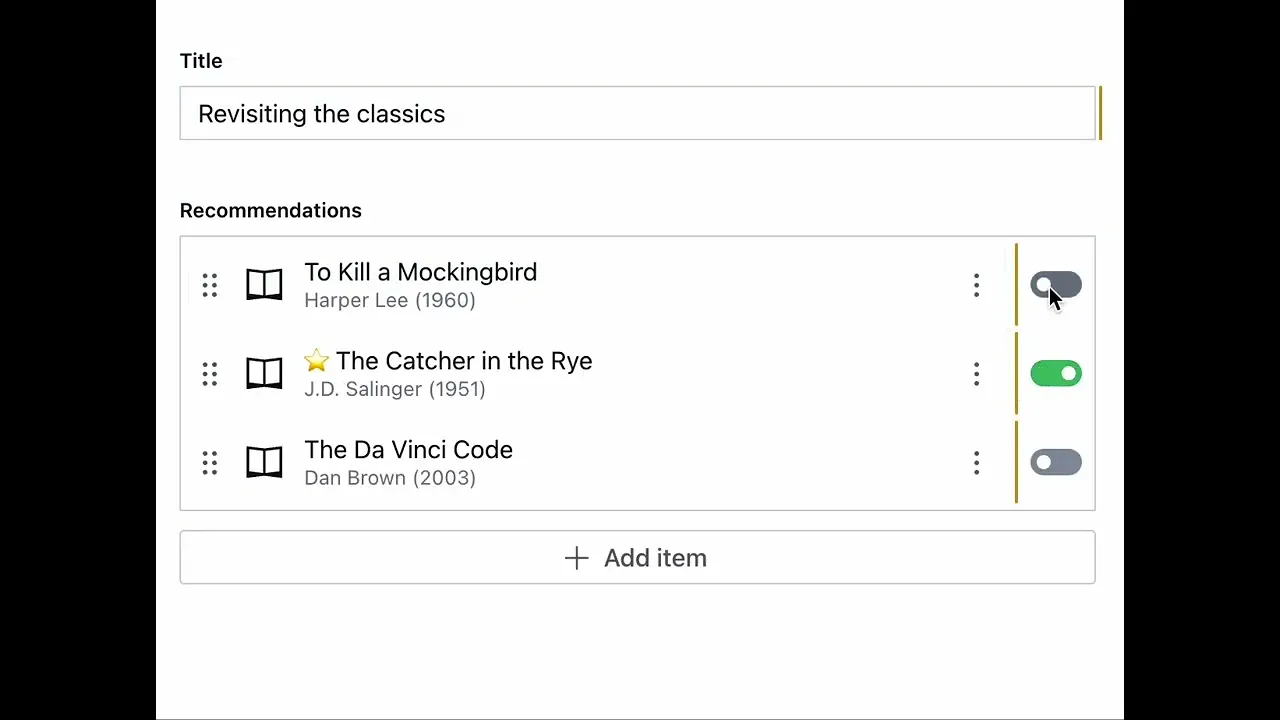 // ./schema/recommendation/RecommendationItem.tsx import {ObjectItemProps} from 'sanity' import {Box, Flex, Switch} from '@sanity/ui' import {Recommendation} from './recommendationType' export function RecommendationItem(props: ObjectItemProps<Recommendation>) { return ( <Flex gap={3} paddingRight={2} align="center"> <Box flex={1}>{props.renderDefault(props)}</Box> <Switch checked={props?.value?.featured} /> </Flex> ) }