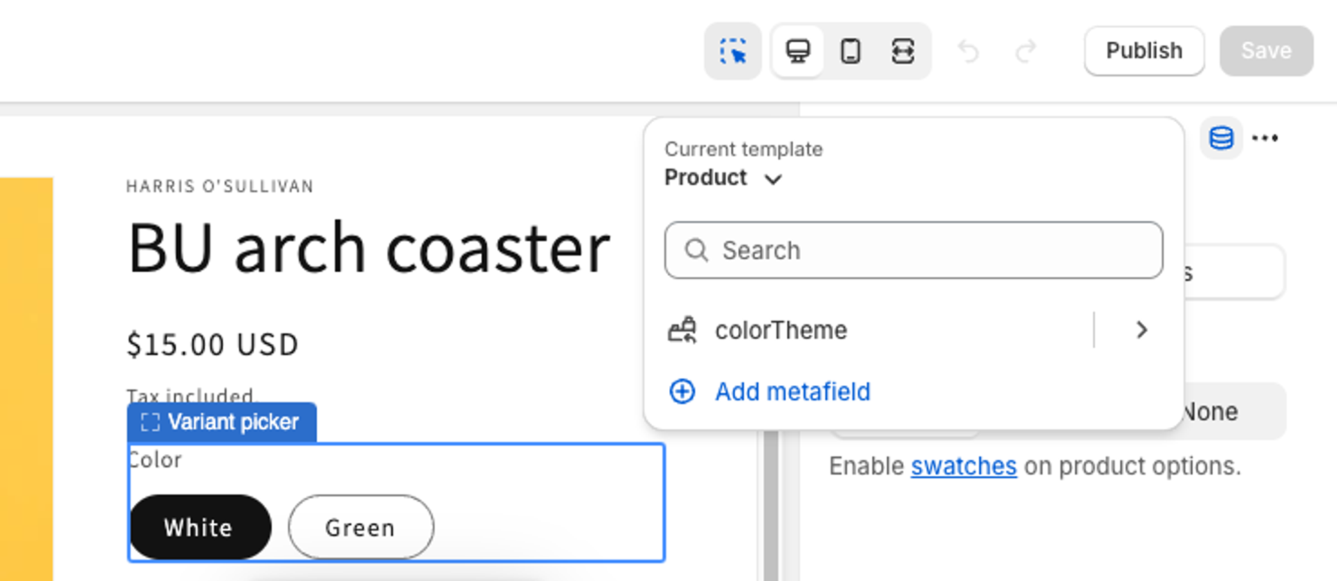 In the visual theme editor, you can select metafields to serve as a dynamic source for an element. Compatible elements will have a ‘Connect Dynamic Source’ option available. This option will list available metafields whose type definitions match the inputs required for the component.