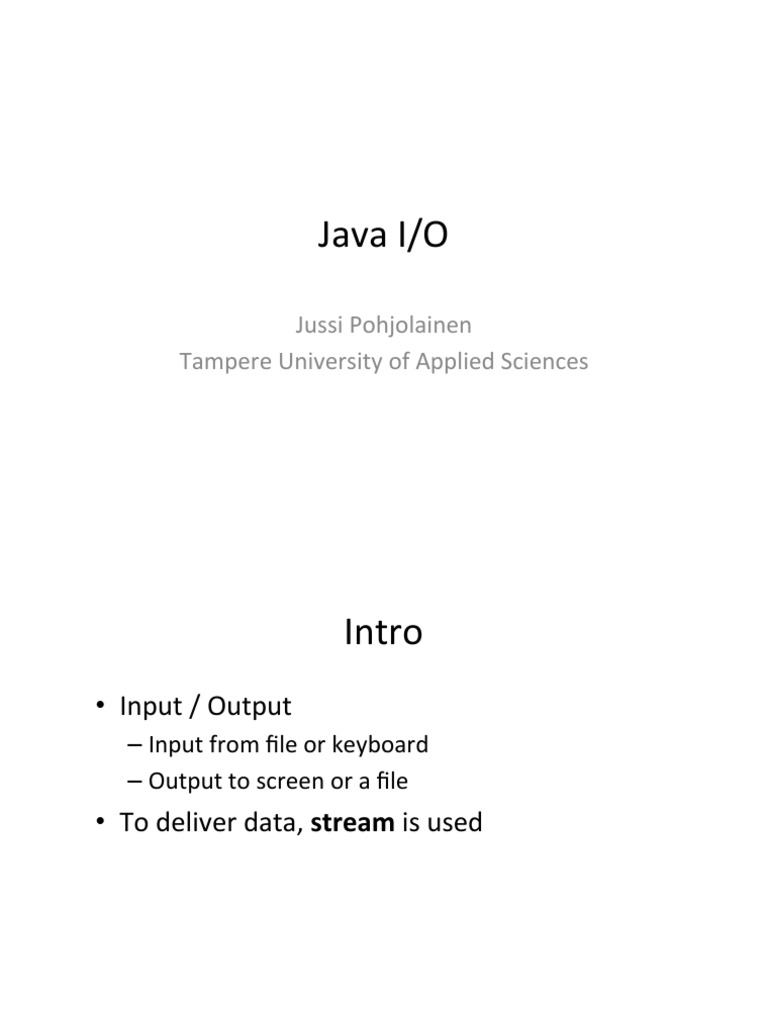 java.io is suitable for basic needs. When there is a need for higher performance, use Java NIO (New I/O) (java.nio) Less GC, less threads, more ecient use of operaKng system Provides scalable I/O operaKons on both binary and character les. Also a simple parsing facility based on regular expressions A li^le bit harder to use than java.io