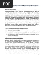 This study examines the state of corporate governance (CG) in Bangladesh. Since the early 1990s, CG has been receiving increasing attention from regulatory bodies and practitioners worldwide. Corporate sectors are still in its initial stage; nevertheless awareness of the importance of CG is growing. Bangladesh has a liberal policy towards foreign direct investment (FDI). However, when compared to those of the India, Sri Lanka, Pakistan, Thailand and Malaysia, CG in practice and philosophy have up till now remained relatively under - developed in Bangladesh. Further, there appears to be a lack of either market or structural governance mechanisms to discipline errant managers. To govern the corporate environment in Bangladesh, Major guidelines are as follows Securities and Exchange Ordinance 1969 Bangladesh Bank Order 1972 Bank Companies Act 1991 Financial Institutions Act 1993 Securities and Exchange Commission Act 1993 Companies Act 1994 Bankruptcy Act 1997