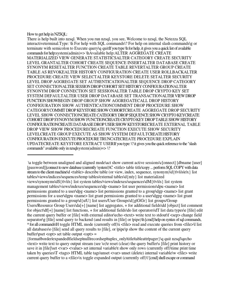 When you run nzsql, you see, Welcome to nzsql, the Netezza SQL interactiveterminal.Type: \h For help with SQL commands\? For help on internal slash commands\g or terminate with semicolon to Execute query\q quitIf you type \h for help, it gives you a quick list of available commands for help:system(admin)=> \hAvailable help:ALTER AGGREGATE CREATE MATERIALIZED VIEW GENERATE STATISTICSALTER CATEGORY CREATE SECURITY LEVEL GRANTALTER COHORT CREATE SEQUENCE INSERTALTER DATABASE CREATE SYNONYM RESETALTER FUNCTION CREATE TABLE REVERTALTER GROUP CREATE TABLE AS REVOKEALTER HISTORY CONFIGURATION CREATE USER ROLLBACKALTER PROCEDURE CREATE VIEW SELECTALTER KEYSTORE DELETE SETALTER SECURITY LEVEL DROP AGGREGATE SET AUTHENTICATIONALTER SEQUENCE DROP CATEGORY SET CONNECTIONALTER SESSION DROP COHORT SET HISTORY CONFIGURATIONALTER SYNONYM DROP CONNECTION SET SESSIONALTER TABLE DROP CRYPTO KEY SET SYSTEM DEFAULTALTER USER DROP DATABASE SET TRANSACTIONALTER VIEW DROP FUNCTION SHOWBEGIN DROP GROUP SHOW AGGREGATECALL DROP HISTORY CONFIGURATION SHOW AUTHENTICATIONCOMMENT DROP PROCEDURE SHOW CATEGORYCOMMIT DROP KEYSTORE SHOW COHORTCREATE AGGREGATE DROP SECURITY LEVEL SHOW CONNECTIONCREATE CATEGORY DROP SEQUENCE SHOW CRYPTO KEYCREATE COHORT DROP SYNONYM SHOW FUNCTIONCREATE CRYPTO KEY DROP TABLE SHOW HISTORY CONFIGURATIONCREATE DATABASE DROP USER SHOW KEYSTORECREATE EXTERNAL TABLE DROP VIEW SHOW PROCEDURECREATE FUNCTION EXECUTE SHOW SECURITY LEVELCREATE GROUP EXECUTE AS SHOW SYSTEM DEFAULTCREATE HISTORY CONFIGURATION EXECUTE PROCEDURE TRUNCATECREATE PROCEDURE EXPLAIN UPDATECREATE KEYSTORE EXTRACT USERIf you type: \? it gives you the quick reference to the "slash commands" available only in nzsqlsystem(admin)=> \?