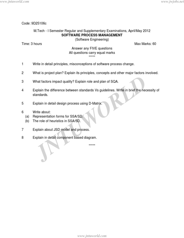Code: 9D25106c M.Tech - I Semester Regular and Supplementary Examinations, April/May 2012 SOFTWARE PROCESS MANAGEMENT (Software Engineering) Time: 3 hours Max Marks: 60 Answer any FIVE questions All questions carry equal marks ***** 1 2 3 4 Write in detail principles, misconceptions of software process change. What is project plan? Explain its principles, concepts and other major factors involved. What factors impact quality? Explain role and plan of SQA.
