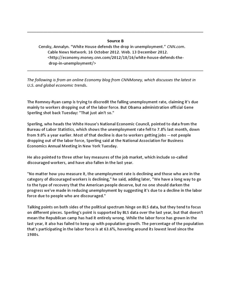 ______________________________________________________________________________ Source B Censky, Annalyn. White House defends the drop in unemployment. CNN.com. Cable News Network.