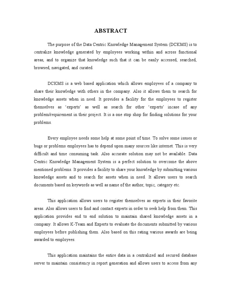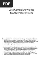 The purpose of the Data Centric Knowledge Management System (DCKMS) is to centralize knowledge generated by employees working within and across functional areas, and to organize that knowledge such that it can be easily accessed, searched, browsed, navigated, and curated. DCKMS is a web based application which allows employees of a company to share their knowledge with others in the company. Also it allows them to search for knowledge assets when in need. It provides a facility for the employees to register themselves as experts as well as search for other experts incase of any problem/requirement in their project. It is a one stop shop for finding solutions for your problems. Every employee needs some help at some point of time. To solve some issues or bugs or problems employees has to depend upon many sources like internet. This is very difficult and time consuming task. Also accurate solution may not be available. Data Centric Knowledge Management System is a perfect solution to overcome the above mentioned problems. It provides a facility to share your knowledge by submitting various knowledge assets and to search for assets when in need. It allows users to search documents based on keywords as well as name of the author, topic, category etc. This application allows users to register themselves as experts in their favorite areas. Also allows users to find and contact experts in order to seek help from them. This application provides end to end solution to maintain shared knowledge assets in a company. It allows K-Team and Experts to evaluate the documents submitted by various employees before publishing them. Also based on this rating various awards are being awarded to employees. This application maintains the entire data in a centralized and secured database server to maintain consistency in report generation and allows users to access from any