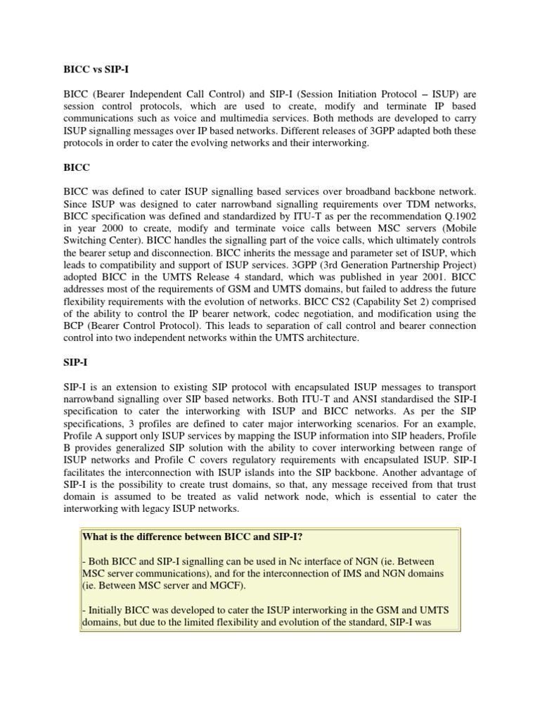 n control protocols, which are used to create, modify and terminate IP based communications such as voice and multimedia services. Both methods are developed to carry ISUP signalling messages over IP based networks. Different releases of 3GPP adapted both these protocols in order to cater the evolving networks and their interworking. BICC BICC was defined to cater ISUP signalling based services over broadband backbone network. Since ISUP was designed to cater narrowband signalling requirements over TDM networks, BICC specification was defined and standardized by ITU-T as per the recommendation Q.1902 in year 2000 to create, modify and terminate voice calls between MSC servers (Mobile Switching Center). BICC handles the signalling part of the voice calls, which ultimately controls the bearer setup and disconnection. BICC inherits the message and parameter set of ISUP, which leads to compatibility and support of ISUP services. 3GPP (3rd Generation Partnership Project) adopted BICC in the UMTS Release 4 standard, which was published in year 2001. BICC addresses most of the requirements of GSM and UMTS domains, but failed to address the future flexibility requirements with the evolution of networks. BICC CS2 (Capability Set 2) comprised of the ability to control the IP bearer network, codec negotiation, and modification using the BCP (Bearer Control Protocol). This leads to separation of call control and bearer connection control into two independent networks within the UMTS architecture. SIP-I SIP-I is an extension to existing SIP protocol with encapsulated ISUP messages to transport narrowband signalling over SIP based networks. Both ITU-T and ANSI standardised the SIP-I specification to cater the interworking with ISUP and BICC networks. As per the SIP specifications, 3 profiles are defined to cater major interworking scenarios. For an example, Profile A support only ISUP services by mapping the ISUP information into SIP headers, Profile B provides generalized SIP solution with the ability to cover interworking between range of ISUP networks and Profile C covers regulatory requirements with encapsulated ISUP. SIP-I facilitates the interconnection with ISUP islands into the SIP backbone. Another advantage of SIP-I is the possibility to create trust domains, so that, any message received from that trust domain is assumed to be treated as valid network node, which is essential to cater the interworking with legacy ISUP networks. What is the difference between BICC and SIP-I? - Both BICC and SIP-I signalling can be used in Nc interface of NGN (ie. Between MSC server communications), and for the interconnection of IMS and NGN domains (ie. Between MSC server and MGCF). - Initially BICC was developed to cater the ISUP interworking in the GSM and UMTS domains, but due to the limited flexibility and evolution of the standard, SIP-I was
